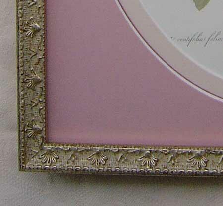 繊細なアンティークスタイルの額は、美しいオーバルマットの額装がエレガントな雰囲気を醸し出しています。細身の額なので、額が主張し過ぎず、ルドゥテの薔薇(ルドゥーテローズ)が薔薇をひきたてるフェミニンな印象のオーバルピンクマットから浮かび上がってくるかのようです。