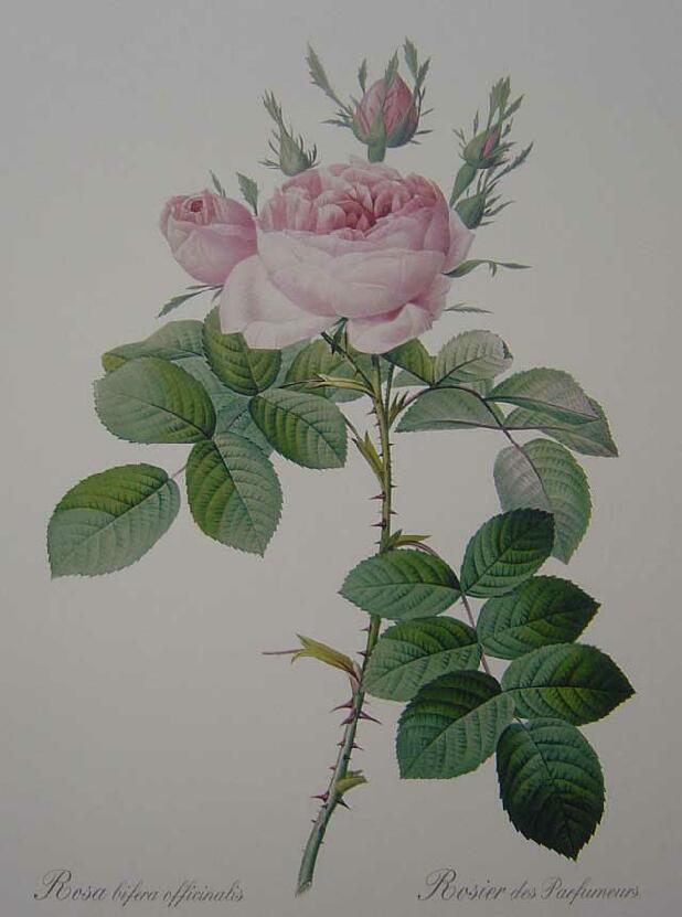 描かれている美しいバラ(オールドローズ)の絵はロサ・ビフェラ・オフィキナリスです。