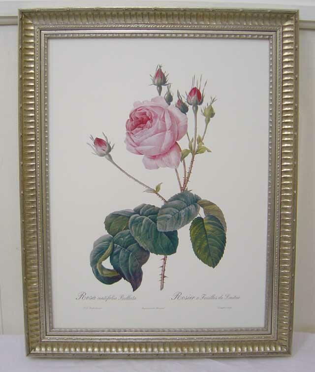ルドゥーテの薔薇(ルドゥテローズ)の美しい大判の額絵です。ボタニカルアート(植物画)の頂点をきわめ、「花のラファエロ」とも賞賛されている天才画家、ピエール・ジョセフ・ルドゥーテの作品の中から、香るように美しいルドゥーテの薔薇の絵を厳選して、ヨーロピアンアンティークの素適な雰囲気を持ったアンティークシルバー・フレーム(アンティークではありません。)で額装されている大判の美しい額絵です。