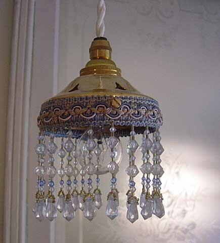 * 真鍮ソケットのホワイトコード器具(他にブラウンもあります。同売り場にてご紹介しています。)に取り付けてダクトレールを使用してビーズランプを3個位下げると、大変素敵です。(参考までに、コード器具に取り付けた他のビーズランプ2個とダクトレールに並べて下げたイメージ画像(下)をどうぞご覧ください。イングリッシュローズコテージの自宅ではメインの照明とは別に、雰囲気を楽しむために簡易取り付けタイプのダクトレール1m(3mコンセントコード付き)を天井に取り付けて、ビーズランプのアンティークな雰囲気の優しい灯りの演出を楽しんでいます。3本下げる場合左右のコードを50cmを使用し、中央に90cmのコードを使用し、その時々の使用の目的により中央のコード器具の長さを途中で軽く結わえて、長さ調節して楽しんでいます。)