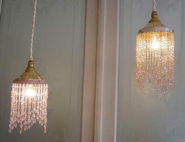実際にコード器具に取り付けて灯りを灯すと、画像のように、ビーズからこぼれる美しい灯りのきらめきをお楽しみいただけます。ビーズランプシェードのロマンティックな灯りのある暮らしをぜひ楽しんでいただきたくて...。