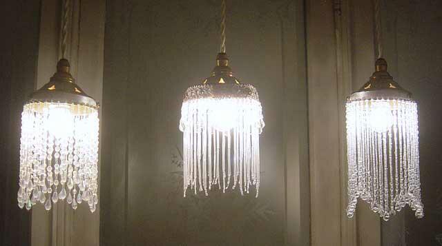 下はビーズランプシェード売り場でご紹介させていただいているビーズランプを3個(ホワイトオパール、クリスタルシャワー(クリア)、クリスタルレインドロップ)並べて下げたイメージ画像です。下の画像は画像に納める関係上、3つを近づけて下げましたが、イングリッシュローズコテージの自宅ではこの3つのビーズランプシェードがとりわけお気に入りなので、3つをもう少し離して並べて、同じラインに下げる仕方を気に入っています。