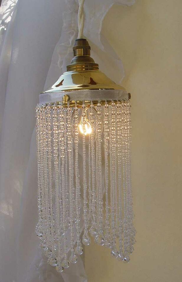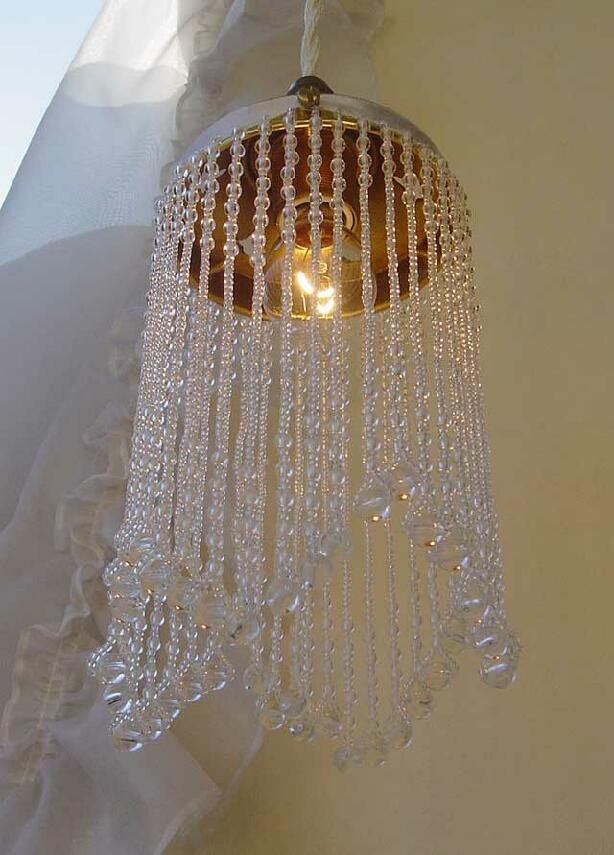 実際にコード器具に取り付けて灯りを灯すと、画像のように、ビーズからこぼれる美しい灯りのきらめきをお楽しみいただけます。ビーズランプシェードのロマンティックな灯りのある暮らしをぜひ楽しんでいただきたくて...。