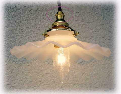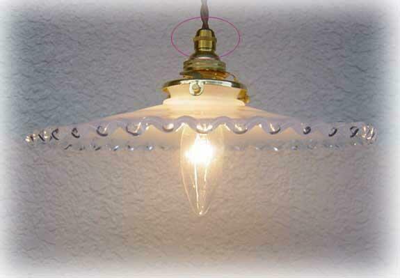 * ショップ別館のミルクガラスのランプシェード売り場でご紹介しているミルクガラスのランプシェードにも真鍮ソケットのペンダントコード器具は雰囲気がぴったり合い、お洒落な雰囲気で素敵です。○で囲んだソケットの上の部分のネジが一般的によく見られる黒いプラスティックネジではないので、フレンチテイストの素適な雰囲気が損なわれません。