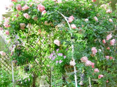 2本のアーチを占領できるようになり,陽光もいっぱい当たって,すくすく,おおらかに若枝を伸ばせるようになったスパニッシュビューティは、今年、大きな花弁をたわわにほころばせ,とっても嬉しそうで、ほっとしました。