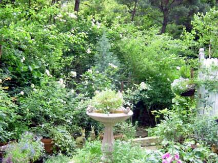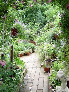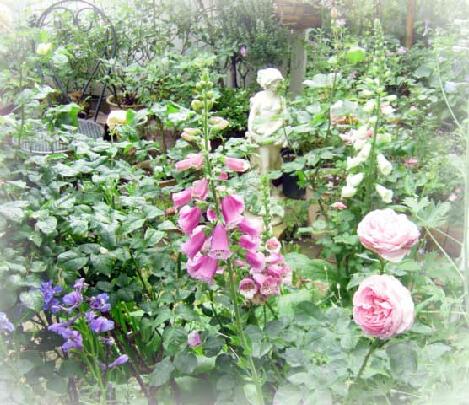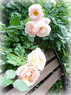 一番花のシーズンも終わりに向かい,遅咲きのヘリテージが、イブリンとともにベンチに座る人をその芳しい香りで,幸せにしてくれます.