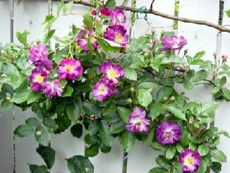 ニュードーンがなくなって,寂しくなったホワイトフェンスに今年は8号鉢で育てているファイルフェンブラウを誘引してみました.別名ブルー・ランブラーとも呼ばれているこの薔薇は赤紫に独特の美しいブルーが入り,大好きな薔薇の一つです.