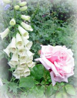 例年より薔薇たちにちょっと出遅れて花穂を開いたミルク色のジギタリス。.
