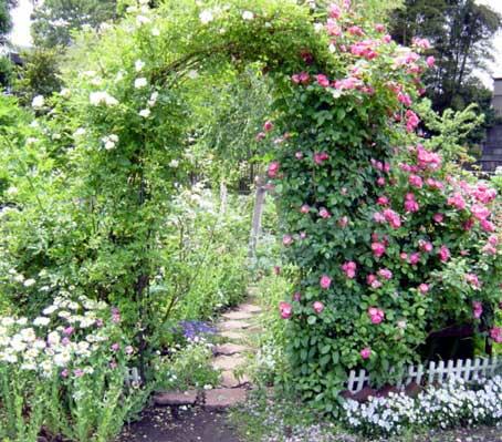 アーチに絡めたつる薔薇サマースノーとアンジェラがゲストを優しく迎えてくれます.