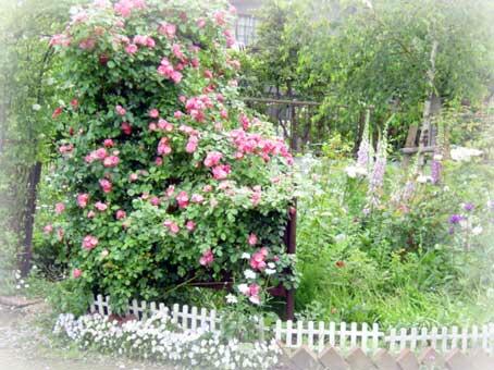今年の5月は私が忙しく,あまり出かける機会をもてなかったのですが,中旬のある晴れた気持ちの良い日,小さなコッテージガーデンを持っていらっしゃるTomokoさんのお庭にお招きを受けました。私と同じく薔薇を愛するTomokoさんのおうちは敷地がとても広大過ぎて、野菜畑も作っていらっしゃる、本当に農家のように広いスペースのお宅なため、かえって可愛いお庭を作りにくい感じなのですが、Tomokoさんは広い敷地の中の一部を丸く囲って区切り、とっても可愛らしいコテージガーデンを作られました.薔薇の時期は宿根草と一緒にナチュラルな感じに薔薇たちが美しいカラーハーモニーの競演を奏でて、本当に童話のなかのお庭のようにとっても可愛らしいのです.煉瓦で丸く囲んだ小さなコテージガーデンの入り口はアーチに絡めたつる薔薇アンジェラ。 ガーデンの中央にはシンボルツリーに白樺が一本植わっていて、とっても夢を感じる秘密の花園のように素適!です。