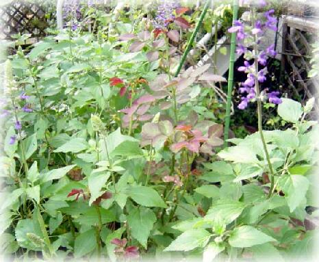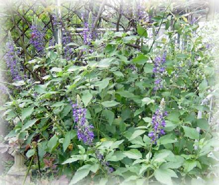 まだまだ残暑が厳しいというのに、ガーデンではラベンダーセージが青い涼しそうな顔をしながら、背を高く伸ばして、咲いています.何年か前に3号のポリポットで求めた挿し木苗から育てては、剪定のたびに出た枝を捨てきれなくて、挿し木を幾つも作ってしまい、これじゃ庭中セージ畑になりそうだよ.何とかしないと薔薇たちが可哀相だよ.とpekoちゃんに言われ、冬になると株ごと抜いては随分あちこちへお嫁に行ったのです.だいぶ減らしたはずなのに、薔薇の元肥を一緒に吸収するためか、我が家のラベンダーセージは本当に元気いっぱい.ちょっと目を離すとぼうぼうに伸びてしまうので、咲き柄を摘むたびにかなり深めに床屋さんカットをするのですが、またしばらくすると、枝分かれして、ますますうっそうと茂って、本当に庭中セージ畑になりそうです。小道も通れないほどジャングルになって、pekoちゃんが「これじゃ歩けなくて、水遣りもできないよ〜!」と悲鳴をあげる前に、本当に何とかしなくてはいけないのですが、どうしましょう。とっても可愛くて大好きな花です.