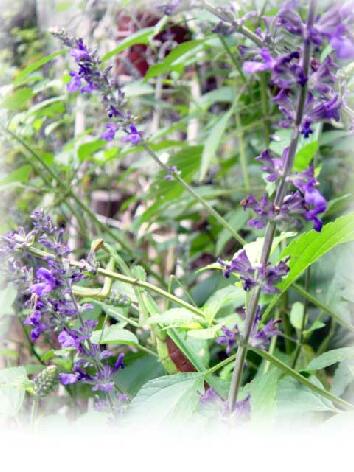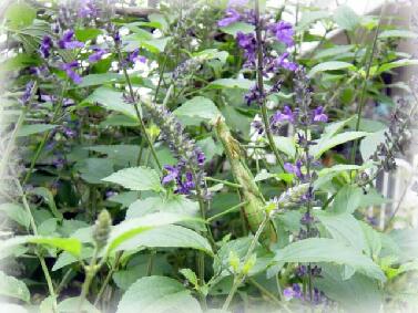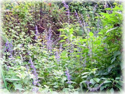 お庭では先月に引き続き、ますますラベンダーセージが空に向かって背高く、幅もますます広がって大きく成長し、アーチの左側の小道に入れなくなり、いったんアーチをくぐって大回りしなければならなくなるほど。 ぼんやりと重たい空気の中、ブルーがとりわけ映えます。
