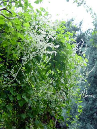 アーチの右側では、昨年の秋に植えたナツユキカズラの小さな赤ちゃん苗が、つる薔薇につかまりながら、とうとうアーチのてっぺんまで登りつめ、そこから優しく清楚な花をたくさん咲かせているので、その下を通ると素適な気分です.