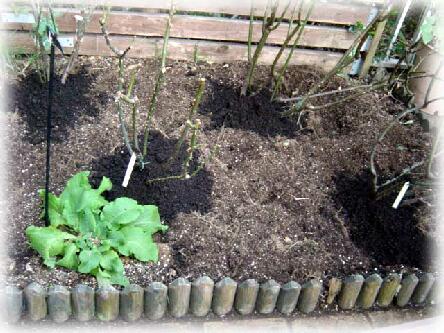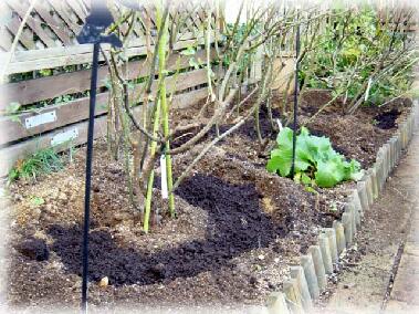 この時、横に伸びている薔薇たちの細根をどっさり切る事になります(根切り)が、かえって新たな根の成長を促す事になり、一石二鳥です.そして溝のなかに、1本につき、発酵油粕200g, 骨粉200g, 硫酸カリ30gをさーっと全体に平均しながら入れ、小さ目のバケツ1杯分の発酵牛糞を加えながら、掘り上げた土も戻しながら、溝部分をよく全体に混ぜつつ、すきこみます.多少、根に当たっても外側の土とよく混ぜ込めば、冬のこの時期はあまり心配しなくて大丈夫です.