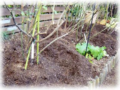 12月30日、まず元肥を入れるための溝を掘る前に、薔薇たちを1本1本、ざっと仮剪定してゆきます.長く伸びきった枝が冬の北風に揺さぶられて、せっかくこっくりこっくり眠りにつき始めた薔薇たちがたたき起こされてしまうことのないようにね。 それにざっと短く剪定しておくと不意に積もった雪の重みで枝が折られる心配もしなくて済むので、安心です.