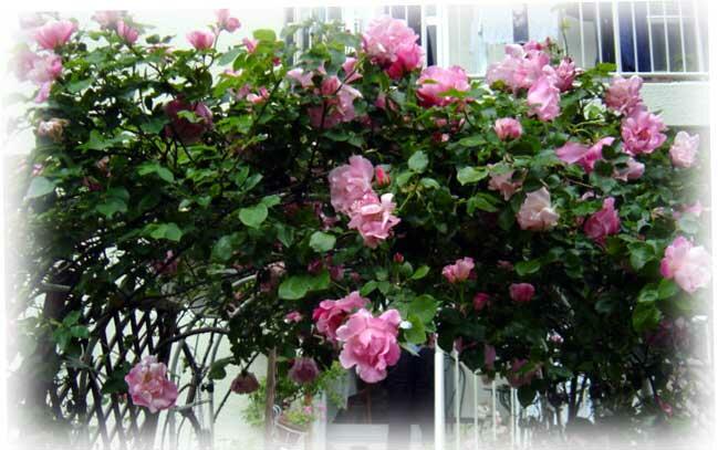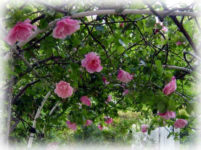 小さなアーチの中を通るとき、上から降ってくるようにこぼれ咲く、ピンクのドレスのお嬢さんたちを眺めるのがとっても好き...。