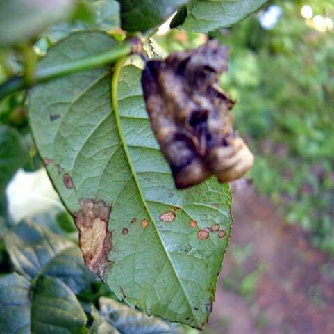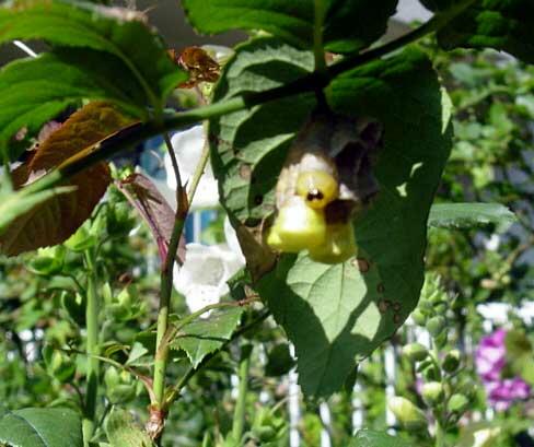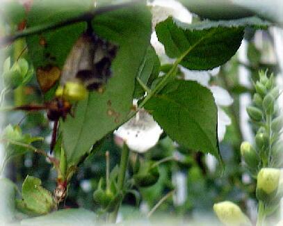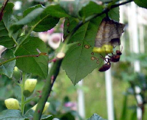 5月のある日、低気圧に吹き飛ばされた枝先を剪定しながら、薔薇たちの見回りをしていたら、シャリファの5枚葉の裏側で子育てに忙しいお母さん蜂を見つけました。