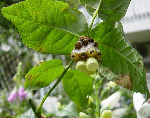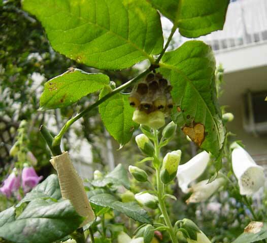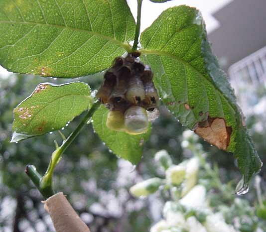 ざっと剪定するはずだったシャリファのその枝はそのままにして、お母さん蜂の子育てを見させてもらうことにしました。 一生懸命作った可愛い蜂の巣にやがて卵を産んだのかしら?
