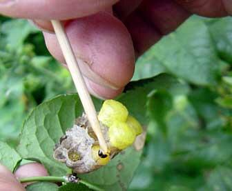 かがみこんで見てみると、中に幼虫らしきものがいる気配がします。