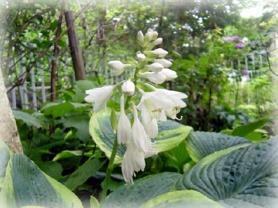 6月も中旬から下旬に向かう頃、ハーブの六角花壇ではオレガノの花がほころび始め、白樺の根元では、ギボウシが大きく葉を茂らせ、美しい清楚な白花を咲かせ始めていました。