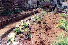 例です。でも花壇が子供っぽくなり過ぎてしまうので、今年から、庭のあちこち、アーチの 中や、トレリスetc.にハンギングフックや寄せ植えで、吊るして飾る仕方に変えてもらいま した. ![]()