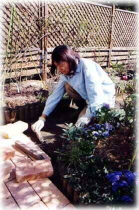 わせて曲線にカットして、それは完璧に仕上げてくれました. 私はどちらかというときち んとし過ぎない、自然な並べ方が好きだけれど、pekoちゃんは一つの作品を仕上げるよう に納得のいくまで、完璧に頑張っちゃうところがあって、それはそれで本当に素適なお庭 になるのですね。 ![]()