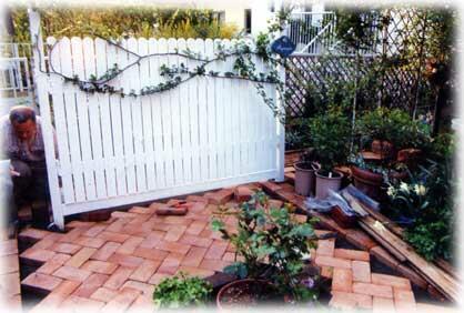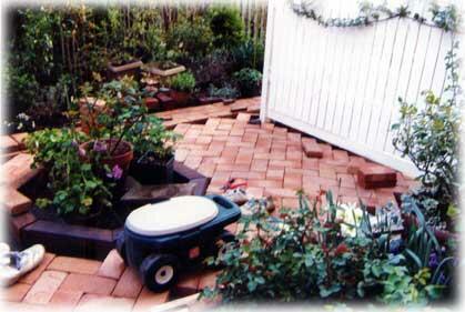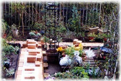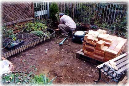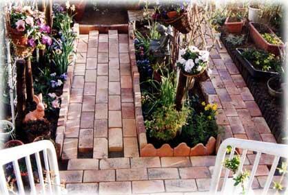 ヘリンボーンでちょっとお洒落なテラスのような雰囲気、そうね、パティオのような中庭の イメージにしたいのです。 しかも単純にヘリンボーンに貼ってゆくのではなく、テラスの部 分は真中に八角の花壇を作って、ベンチに座ったときに後ろからの薔薇の香りと一緒に ハーブの爽やかな香りも楽しめるよう、ハーブ花壇にしたいのです.ヘリンボーンのテラ スの周りは3〜4列くらいのランニングボンドで引き締めた感じがいいな。花壇に沿っての 部分はランニングボンド、そして中央部分を広くヘリンボーンにレンガを張りながら、さら にその中央に八角花壇を作るというのが、どんなに大変かは想像するだけで、う〜ん、き っととっても面倒だろうな、と思うのですが、どうしても夢見たとおりの理想のお庭にしたく て、pekoちゃんへの注文がいろいろ増えてゆきます。