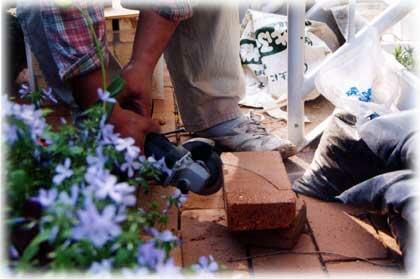 器用なpekoちゃんはガラスをカットするグラインダーを使ってレンガを花壇のカーブに合