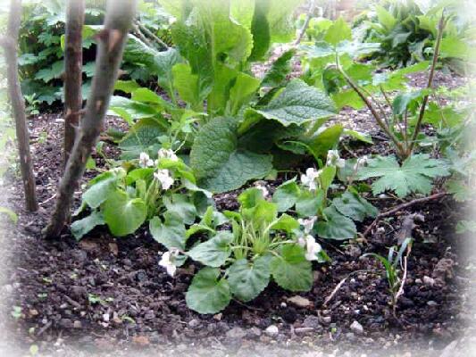 (花壇の中のあちこちに毎年こぼれ種で咲く清楚で可愛い白スミレ、大好きです。)