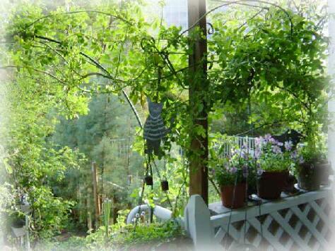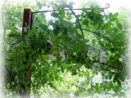 ムルティフローラをカーテン代わりに...、イチゴの花のように可憐な白い一重の小さな 野バラがリンゴの香りとともに、雪が降るようにベランダいっぱい、スプレーでたくさん咲 き零れる頃は本当に夢の中のような幸せを味わえます.) ![]() ![]()