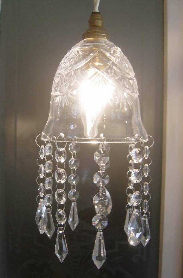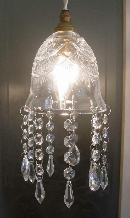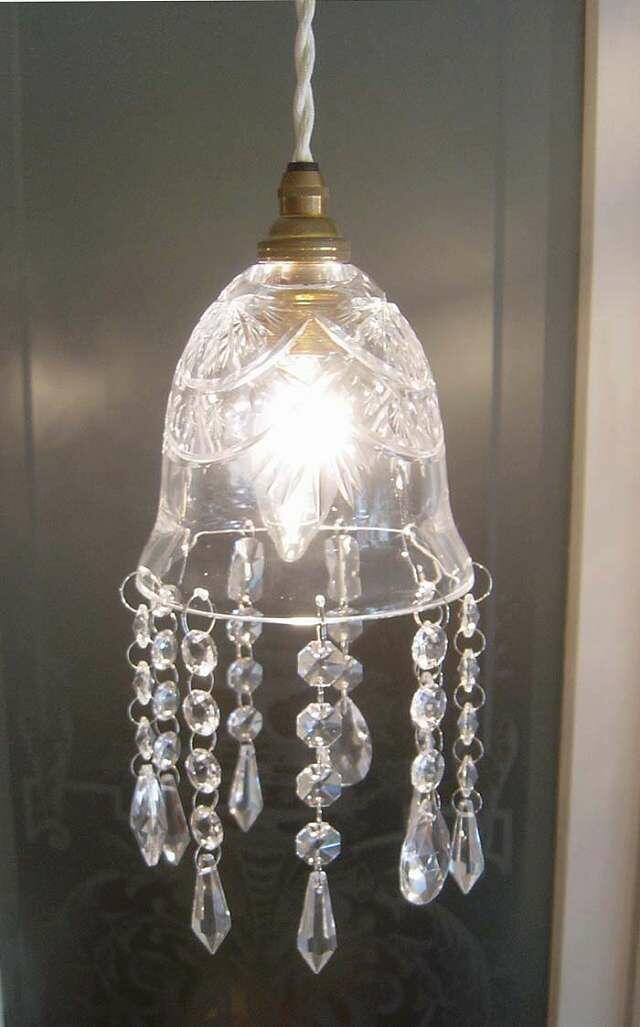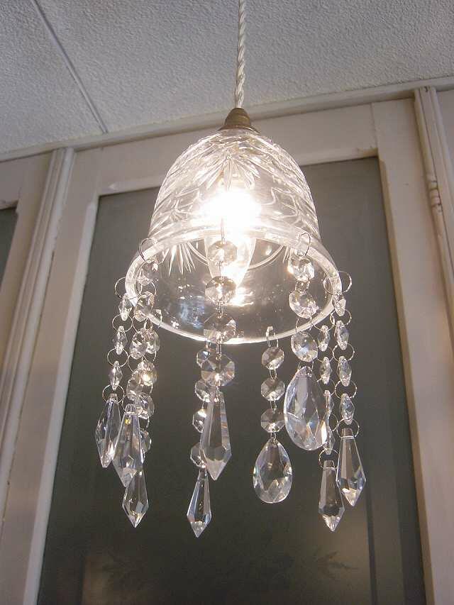 お部屋を洋書スタイルのロマンティックな異空間へと誘ってくれるミニシャンデリアは価格もチープなので、デザインの違うものを並べて下げてみても...。 お奨めのシャンデリアランプです。(クリスタルガラスのオーナメントがロング丈にたっぷりついているディプレッショングラス風プレスドグラスのガラスランプシェードとホワイトツイストコード器具とのセットとなっています。)
