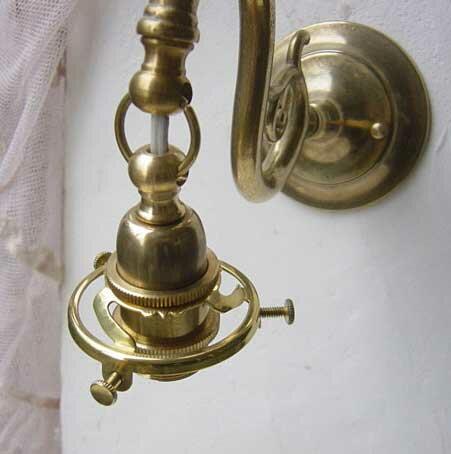 ガラスシェードを取り付けるソケット部分の上についているリングがあることによって、ガラスシェードがベルがぶら下がっているような素適な雰囲気に見えるアンティークテイストたっぷりの素適なデザインの真鍮ブラケットです。