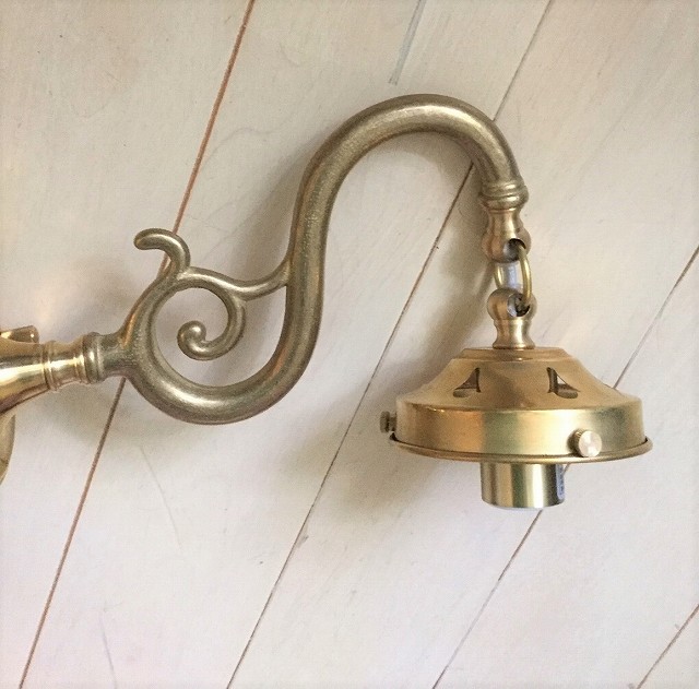 またガラスシェードを取り付けた商品画像では、ブラケットライトのフランジ(壁プレート部分)がアーム部分のように経年経過したようにあえて仕上げたアンティーク仕上げとなっていますが、最近入荷のものは上の2枚のブラケット画像のように、フランジ部分に磨きがかけられた綺麗な仕上がりとなっていることをお知らせいたします。