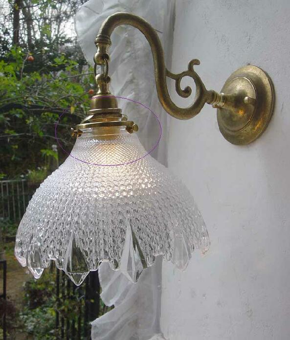 * ガラスシェードを取り付けるための金具がフレンチタイプの金具(下の画像で丸いラインで囲んでいる部分)となっている新仕様です。(こちらのブラケットはソケットの口径が一般的な口径57サイズよりも微妙に径が大きいため、市販されている口径57シェード用のギャラリー(ガラスシェードを取り付けるための金具)を使用することはできません。) シャビーなアンティーク仕上げが大変素適な真鍮のブラケット(ウォールランプ)はフレンチテイストのギャラリーにガラスシェードを取り付けることによりブラケットの全体的な雰囲気が和らいで、優しい印象となっています。