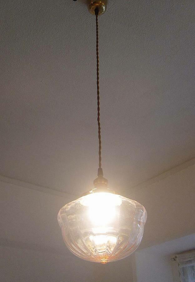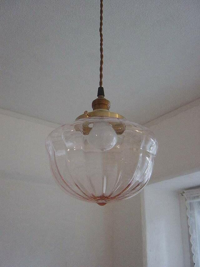レトロなデザインが素敵なビストロ風ガラスのランプと専用ペンダントコード器具のセットです。 ほんのりアンティークピンクを帯びたガラスボウルシェードの素敵なペンダント照明は 玄関ホールはもとより、ダイニング、またリビングに独特のレトロな洋館の雰囲気を作り出してくれます.