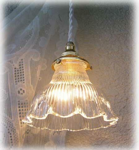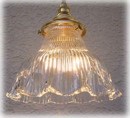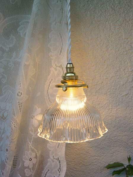 ** 実際に灯りをつけた雰囲気をご覧になっていただけるように、照明器具(コード器具)に取り付けて撮影していますが、本商品はガラスシェードのみとなりますので、コード器具を一緒にご購入なさりたい場合は→こちらのコード器具専用売り場でどうぞお求めください。真鍮ソケットを使用したイギリス、フランスのアンティークの照明器具のデザインを忠実に再現したアンティークテイストの素敵な灯具を各種ご紹介しています。**