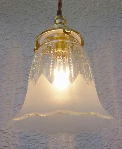 ** 実際に灯りをつけた雰囲気をご覧になっていただけるように、照明器具(コード器具)に取り付けて撮影していますが、本商品はガラスシェードのみとなりますので、コード器具を一緒にご購入なさりたい場合は→こちらのコード器具専用売り場でどうぞお求めください。真鍮ソケットを使用したイギリス、フランスのアンティークの照明器具のデザインを忠実に再現したアンティークテイストの素敵な灯具を各種ご紹介しています。**