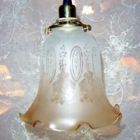 ** 実際に灯りをつけた雰囲気をご覧になっていただけるように、照明器具(コード器具)に取り付けて撮影していますが、本商品はガラスシェードのみとなりますので、コード器具を一緒にご購入なさりたい場合は→こちらのコード器具専用売り場でどうぞお求めください。真鍮ソケットを使用したイギリス、フランスのアンティークの照明器具のデザインを忠実に再現したアンティークテイストの素敵な灯具を各種ご紹介しています。**